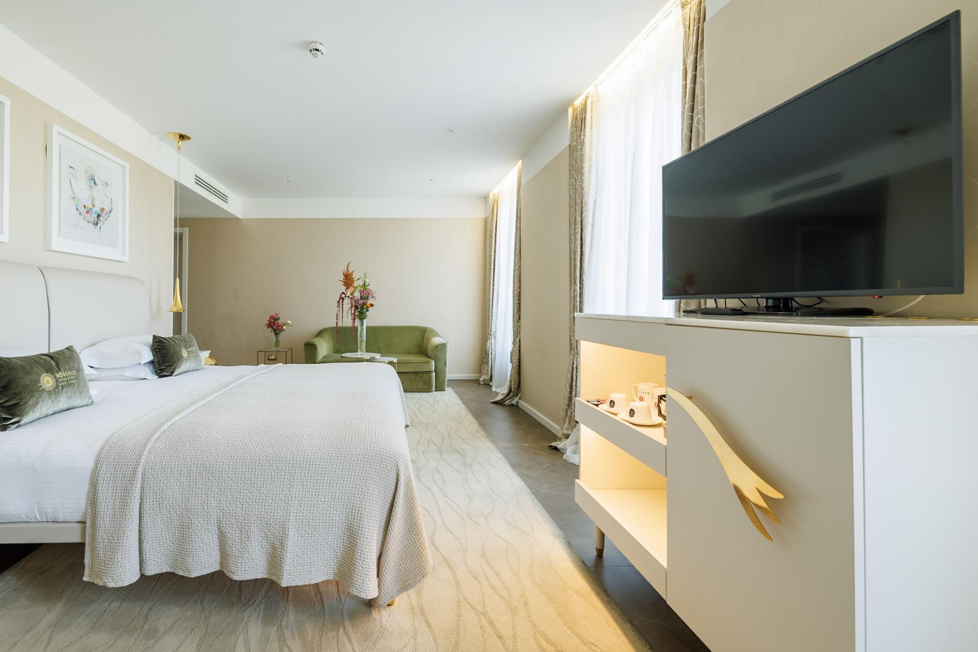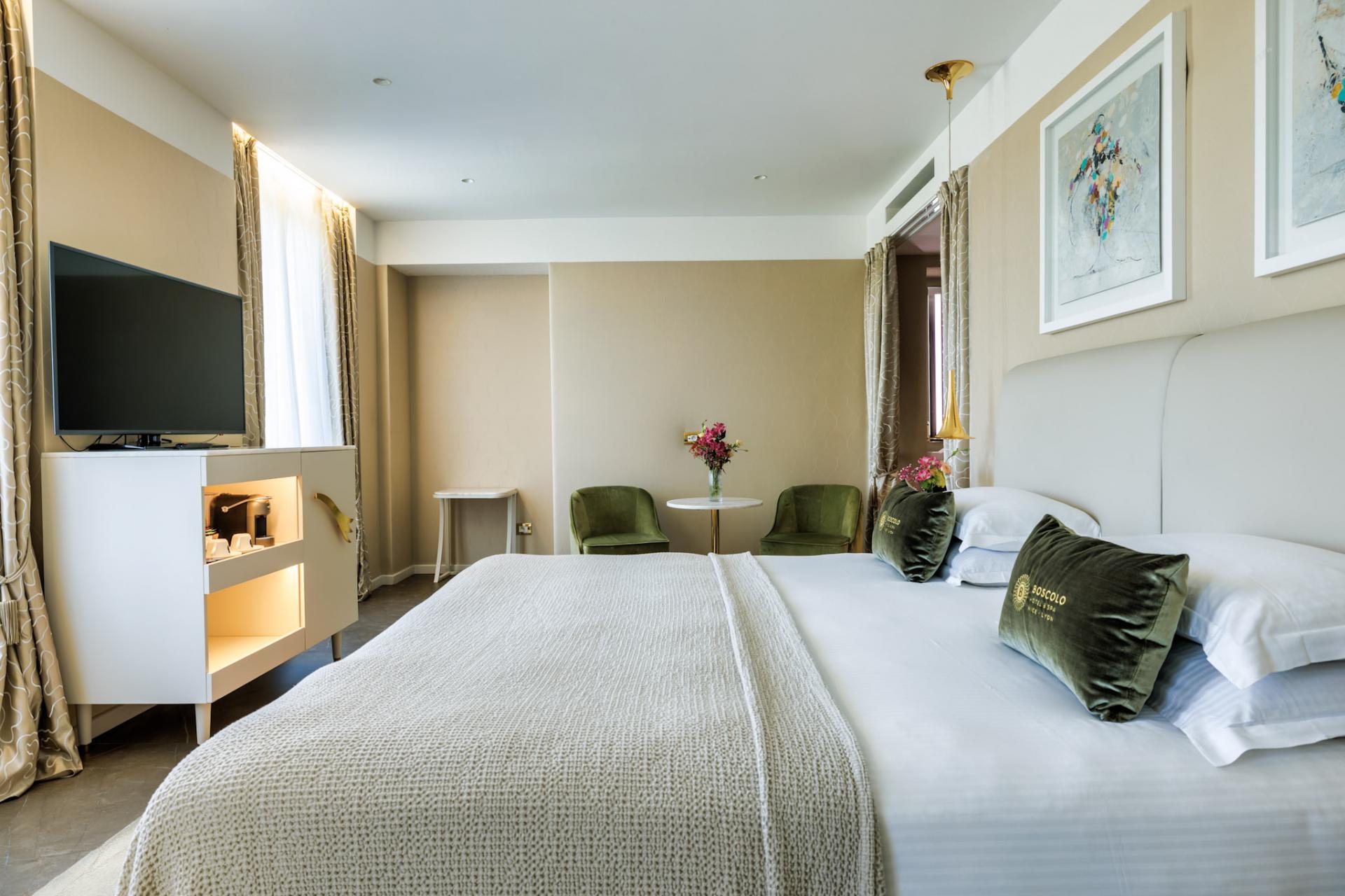The Junior Suite Rhône View reveals a privileged setting where the city and the river meet. From the room, the light reflects on the water and evolves throughout the day, creating a living and soothing backdrop.