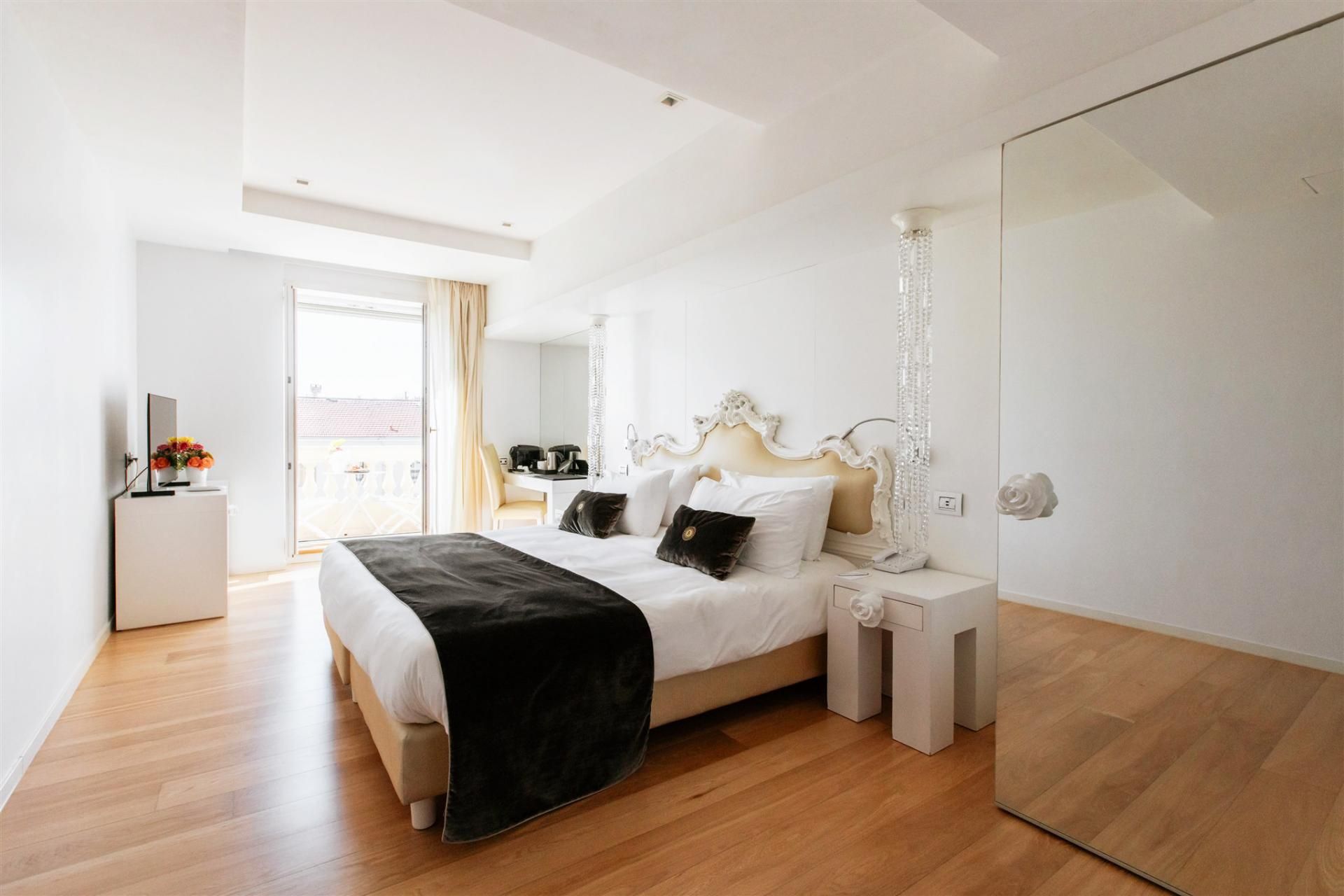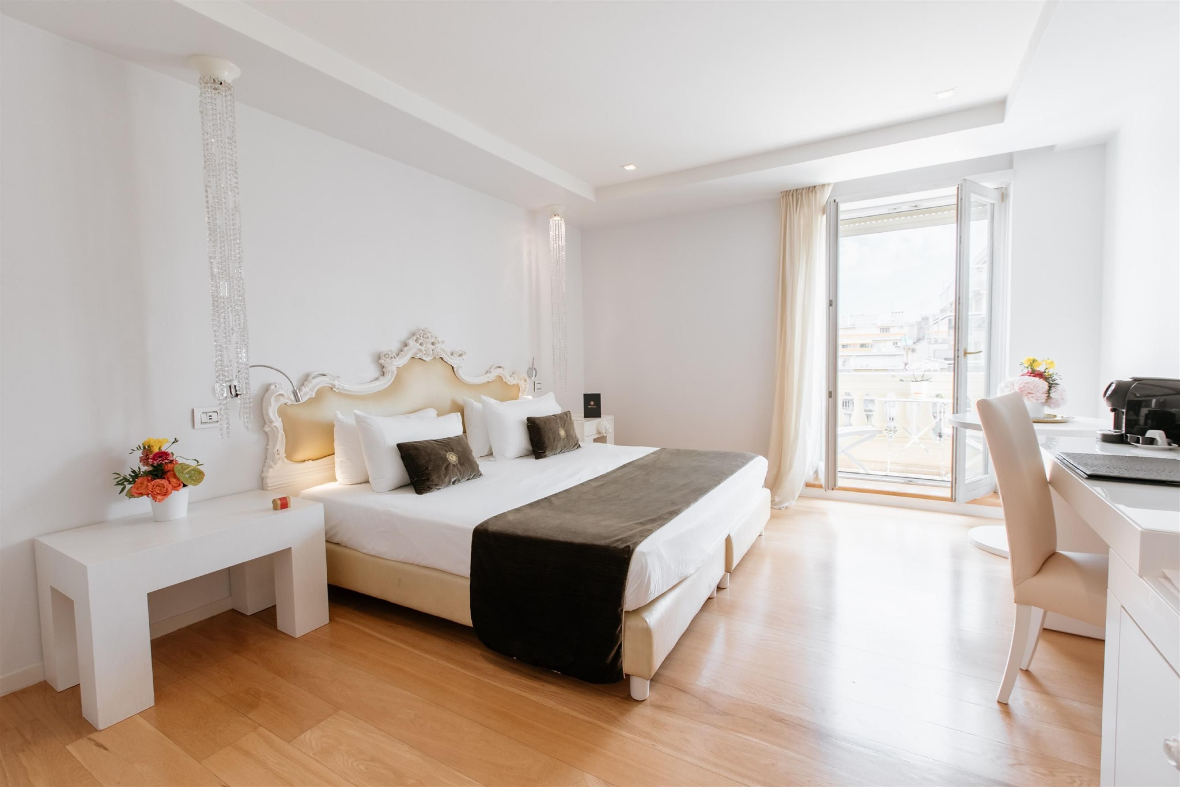 The Deluxe Room with Terrace at Boscolo Nice offers a 35 m² space where comfort and elegance meet naturally. Light tones, golden touches and contemporary furniture create a refined atmosphere inspired by the Italian style that defines the hotel. Light wood flooring and natural daylight enhance the feeling of space and serenity, making it the perfect setting to enjoy your stay on the French Riviera.
