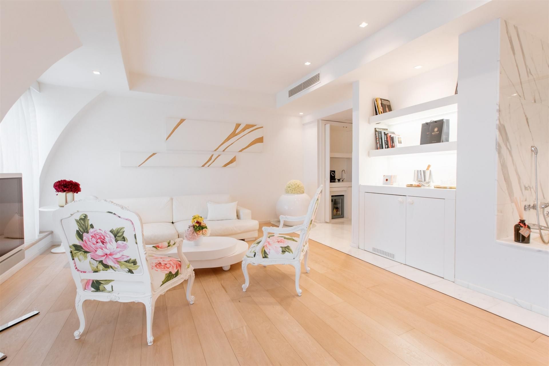 The living area invites you to slow down: read a few pages, share a quiet coffee, or simply enjoy the calm after a day exploring the lively streets of Nice. Every detail, from the armchairs to the delicate floral touches, adds warmth and charm to the space.