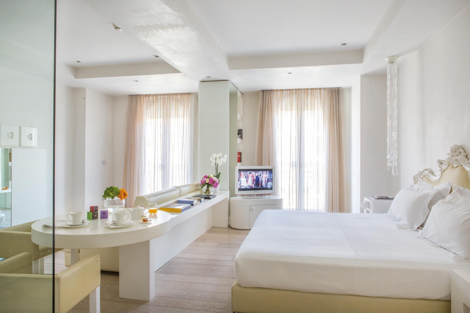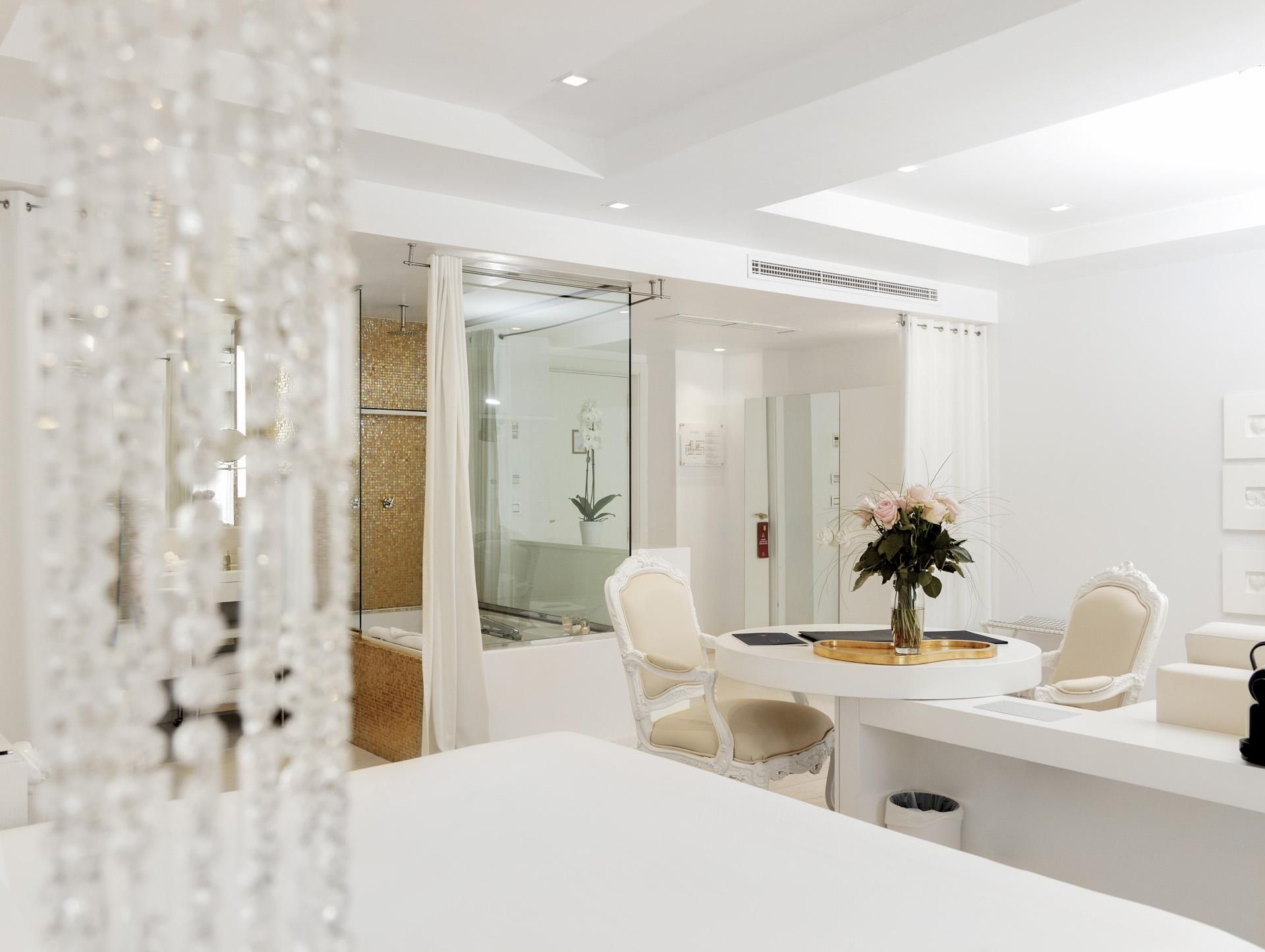 Dès l’entrée dans la Junior Suite, la lumière naturelle enveloppe l’espace et révèle une atmosphère douce et élégante. Les grandes fenêtres, les teintes claires et les lignes épurées créent un décor lumineux où l’on ressent immédiatement l’esprit de la Côte d’Azur. Quelques touches florales, présentes dans la décoration et le mobilier, rappellent les parfums et les jardins méditerranéens qui font le charme de la Riviera.